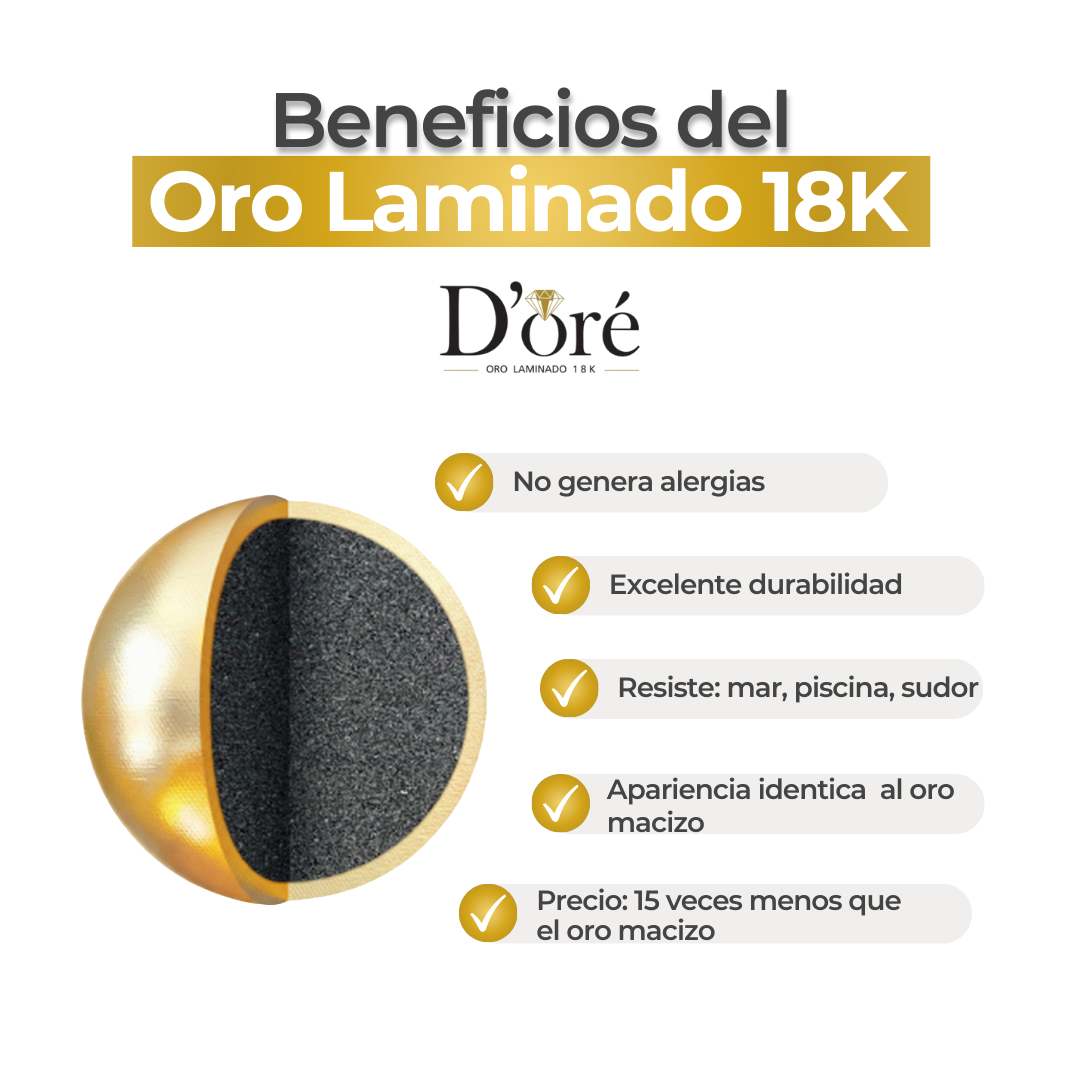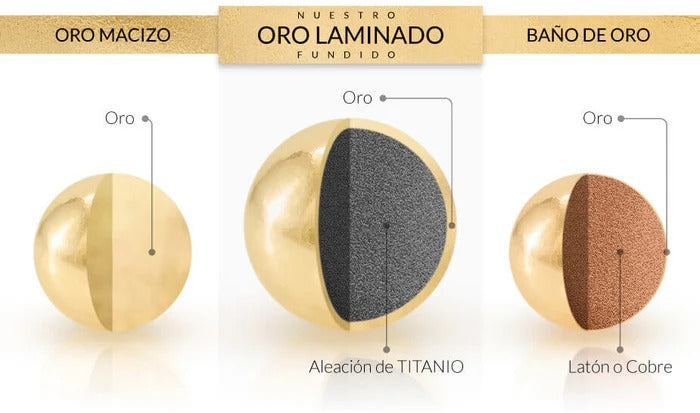 El oro laminado enchapa tres capas gruesas real de oro 18K sobre un metal base, ofreciendo una durabilidad muy superior al baño de oro, que suele desgastarse rápidamente al tener una sola capa muy delgada de oro.